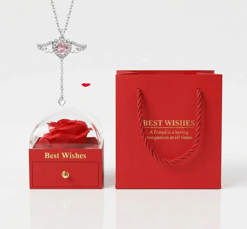 صندوق "الحب الأبدي" باللون الأحمر مع عقد قلب ثمين وردي